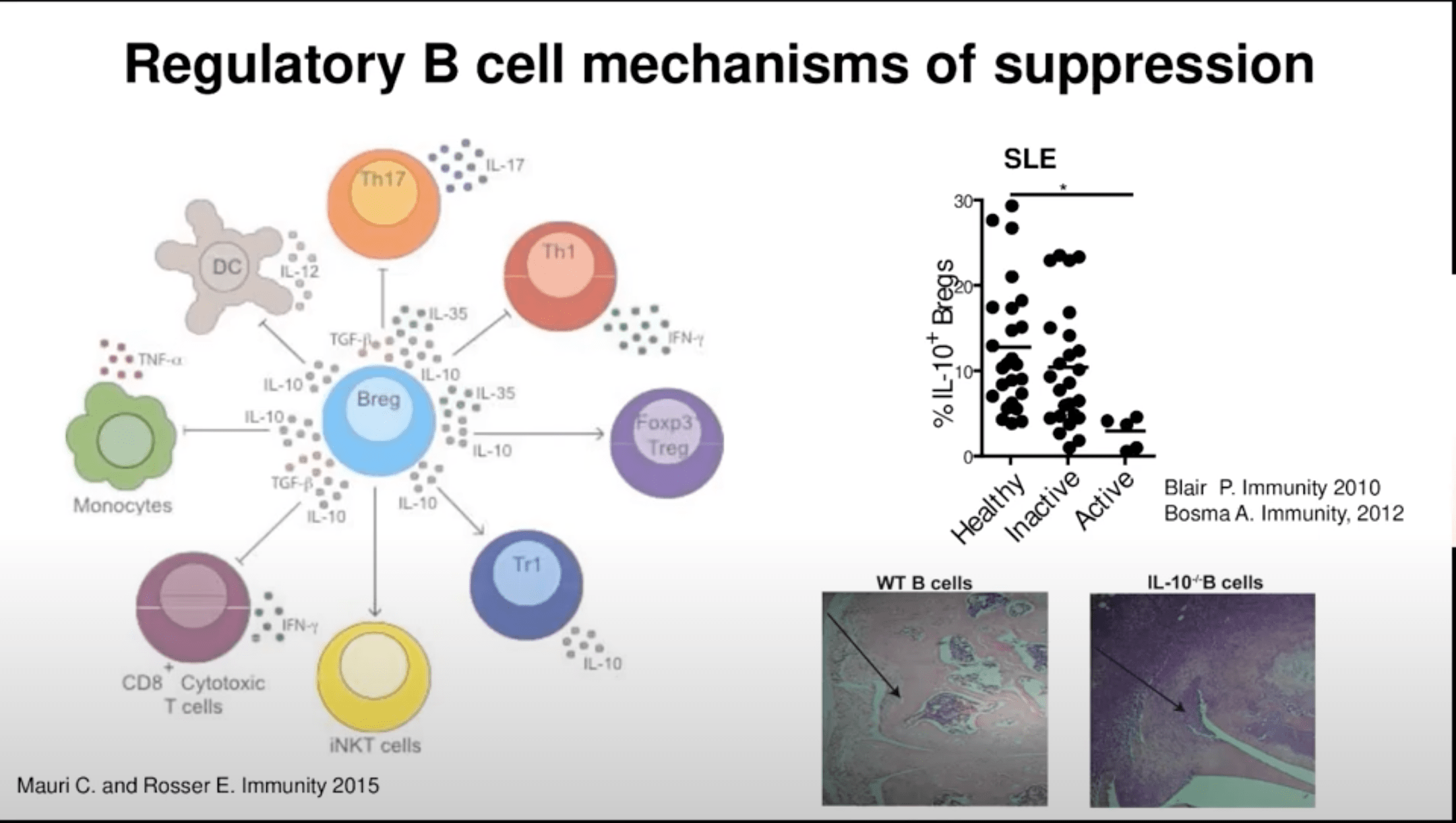 Regulatory B cells (Bregs) are immunosuppressive cells that contribute to the reduction of excessive inflammatory responses. Researchers have demonstrated that interaction between the gut microbiota and the innate immune system in the gut-associated lymphoid tissue (GALT) promotes the differentiation of immature B cells into B-regs. Mice depleted of endogenous bacteria following administration of broad-spectrum antibiotics do not develop arthritis or B-regs, suggesting an intricate relationship between the microbiota, inflammation, and B-reg differentiation. These findings suggest a potential link between microbiota and B-regs, which could occur either (1) due to inflammatory signals induced by interaction with microbiota or (2) direct induced by microbial products by inflammatory. In a recent IUIS-Immunopaedia-Frontiers in Immunology webinar, Claudia Mauri (University College London, UK) discussed how microbial products induce B-regs and their relevance for arthritis pathology.