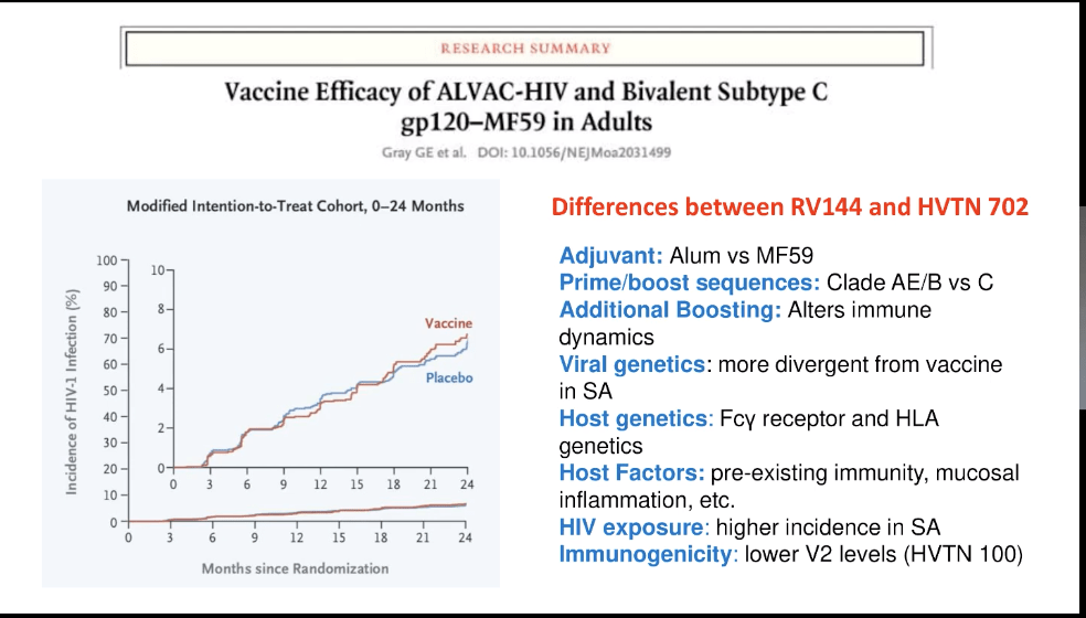 • (ii) HVTN702 trial (similar vaccine as the one tested in the RV144 trials, however, vaccines were modified to clades that are dominant in Sub-Saharan Africa) which was, unfortunately, stopped early due to similar infection rates in vaccine and placebo group.