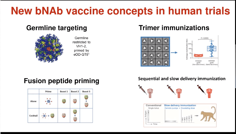 The ultimate aim of the HIV vaccine field is to induce broadly neutralising Abs (bNAbs). Unfortunately, bNAbs take years to develop and may not happen in all individuals, thus a key focus is to understand immunological processes associated with bNAb development with the hope of inducing a similar response using vaccination. New bNAb vaccine concepts are currently in phase 1 clinical trial testing and  include