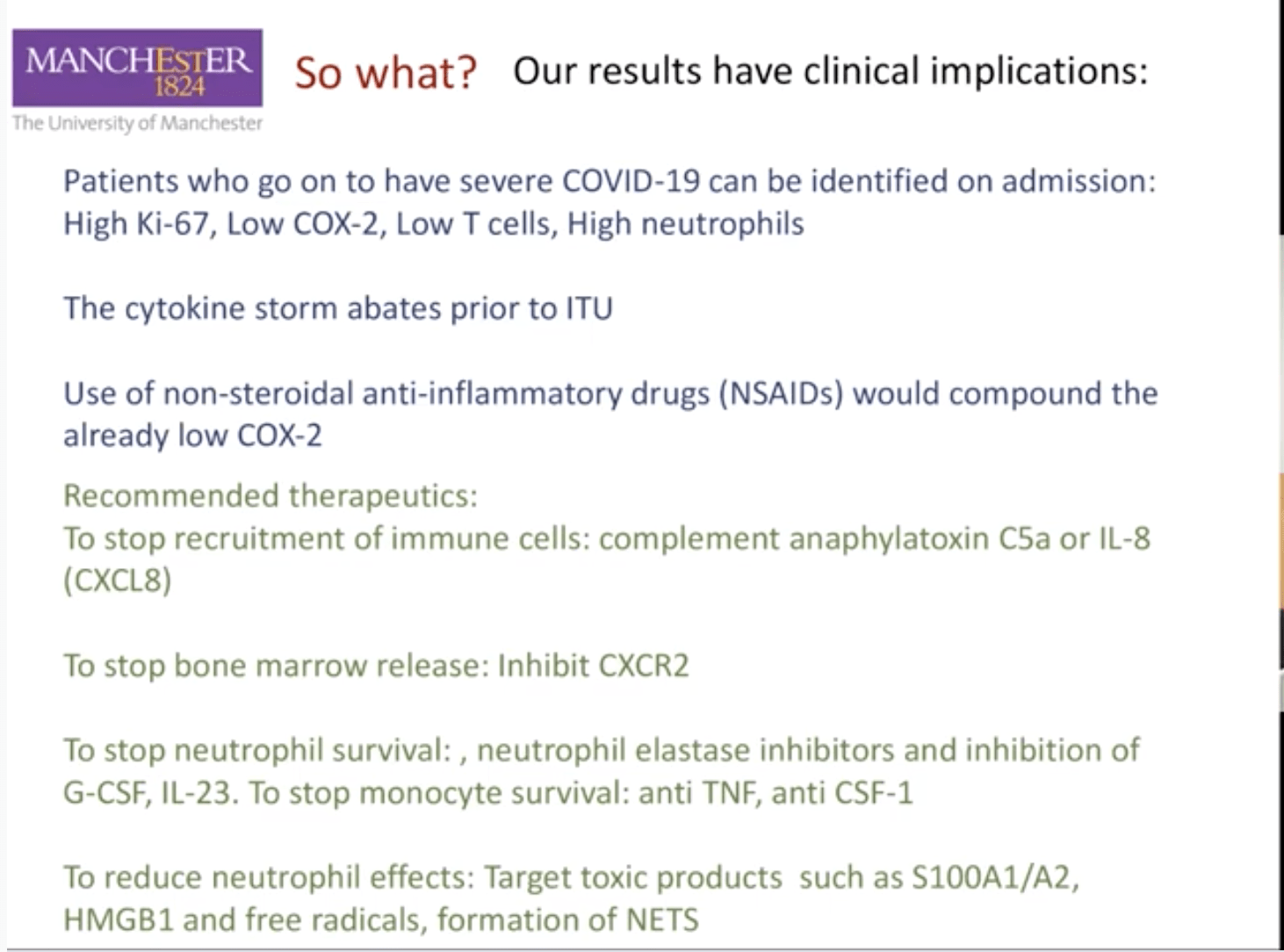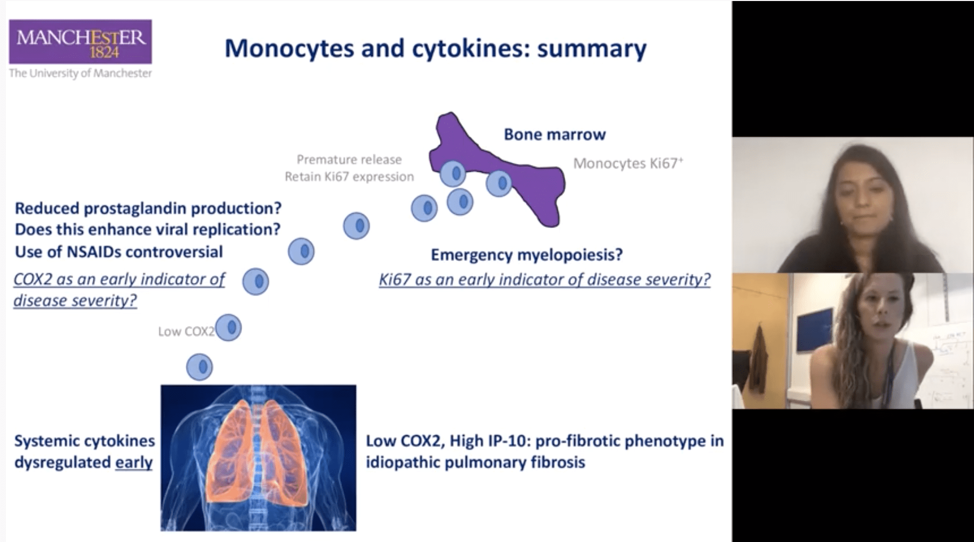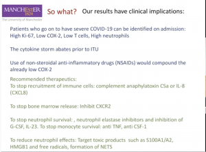 Elizabeth Mann began her talk describing the important roles monocytes play in respiratory infection. She highlighted that though monocytes release important effector functions which aim at controlling viral levels, these molecules can contribute to inflammation and tissue damage if left unchecked. Elizabeth showed that COVID-19 was associated with increased Ki-67+ expressing monocytes which correlated with C-reactive protein (clinical marker of inflammation). She then suggested that detection of this monocyte subset, is could be associated with emergency myelopoiesis (enhanced release of monocytes that express Ki-67). Interestingly, Ki-67 levels decreased with time of infection, suggesting that Ki-67+ monocytes could be an early marker of disease severity. They also showed that COVID-19 was associated with decreased expression of cycol-oxygenase 2 (COX2), and levels of this molecules quickly restore to normal in mild patients. Other highlights of the talk are summarised in the figure below.