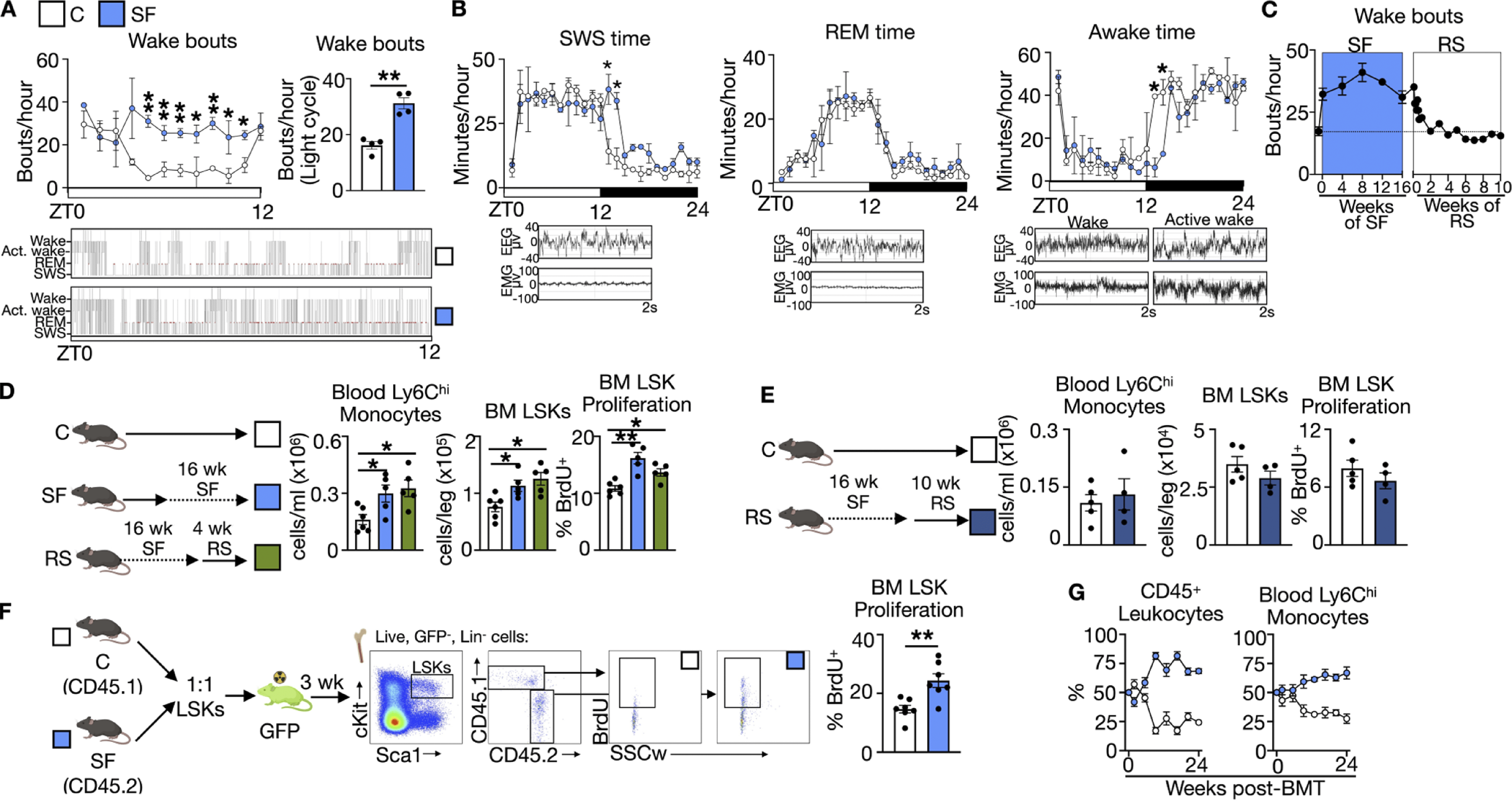 Figure 1: Sleep exerts a prolonged influence on hematopoiesis. (A) Quantification of wake bouts (transitions from sleep to wake states), during the resting (light) period along with a representative hypnogram in control (C) and SF mice. n = 4 mice per group. (B) Quantification of minutes per hour in SWS, REM sleep, and awake time, along with representative EEG and EMG traces, in control and SF animals over 24 h. n = 4 mice per group. (C) Quantification of resting period wake bouts over 16 wk of SF followed by 10 wk of RS. n = 4 mice per group. (D) Enumeration of blood Ly6Chi monocytes and BM LSKs, along with LSK BrdU incorporation in control mice, SF mice, and mice exposed to 16 wk of SF followed by 4 wk of RS. n = 5–6 mice per group. (E) Enumeration of blood Ly6Chi monocytes and BM LSKs, along with LSK proliferation in a distinct cohort of control mice and mice exposed to 16 wk of SF followed by 10 wk of RS. n = 4 mice per group. (F) BrdU incorporation into LSKs from control (CD45.1) or SF (CD45.2) mice 3 wk after competitive 1:1 LSK transplantation into a UbiGFP mouse sleeping habitually. n = 6–7 mice per group. (G) Competitive 1:1 transplantation of LSKs from control (CD45.1) or SF (CD45.2) mice into UbiGFP recipient mice and quantification of CD45.1/2 chimerism among blood leukocytes and Ly6Chi monocytes up to 24 wk after transplantation. n = 8 mice per group. Mean ± SEM. *, P < 0.05, **, P < 0.01.