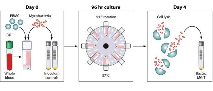 MGIAs measure the ability of immune cells to inhibit of growth of mycobacteria, such as Mycobacterium bovis from the Bacille Calmette-Guérin (BCG) vaccine or Mycobacterium tuberculosis. Despite, being a useful tool for detecting the capacity of individuals to restrict mycobacterial growth, the underlying immunological mechanisms for bacterial growth in MGIAs are still elusive. Studies have suggested that monocyte/lymphocyte ratios, polyfunctional CD4 T cells and even iron metabolism are associated with mycobacterial growth. However, most of these studies have not conclusively demonstrated the immune mechanisms.