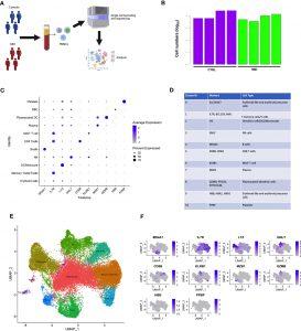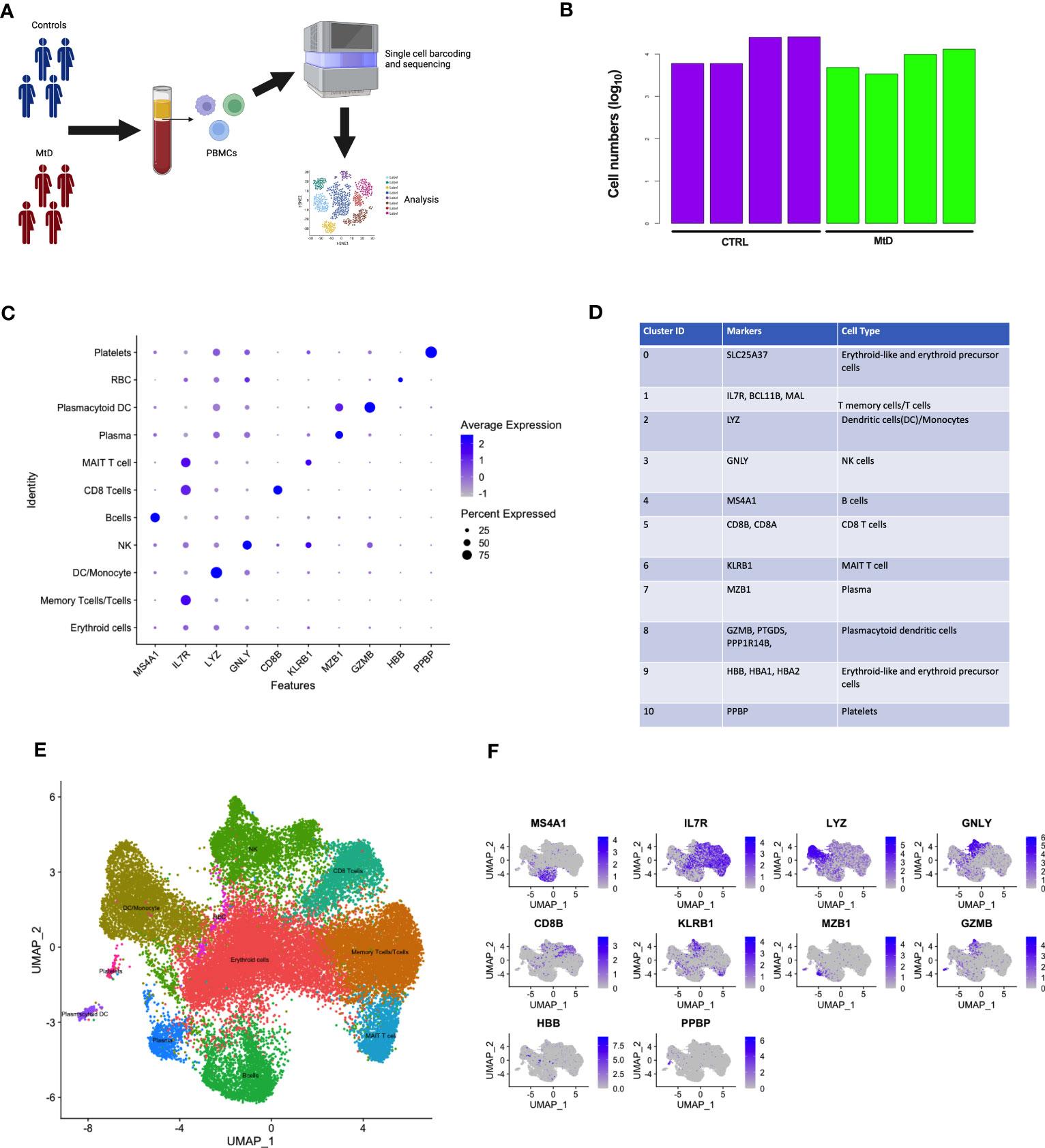 Figure 1: Identification of scRNAseq cell clusters in children with MtD and controls. (A) Peripheral blood mono nuclear cells were collected from children with MtD (N = 4) and matched controls (N = 4). Single cells were sorted, followed by isolation of RNA and sequencing. (B) Log10 cell numbers for analyses from children with MtD and controls. (C) Differential gene expression analyses identified cell specific markers. A dot plot for cellular marks and their alignment with various cell populations was constructed. (D) Table of RNA markers of various immune cell subsets. (E) UMAP clustering of immune cell populations as identified using selected marker genes. (F) Feature plots showing the distribution of cellular markers for the identification of immune cell populations.