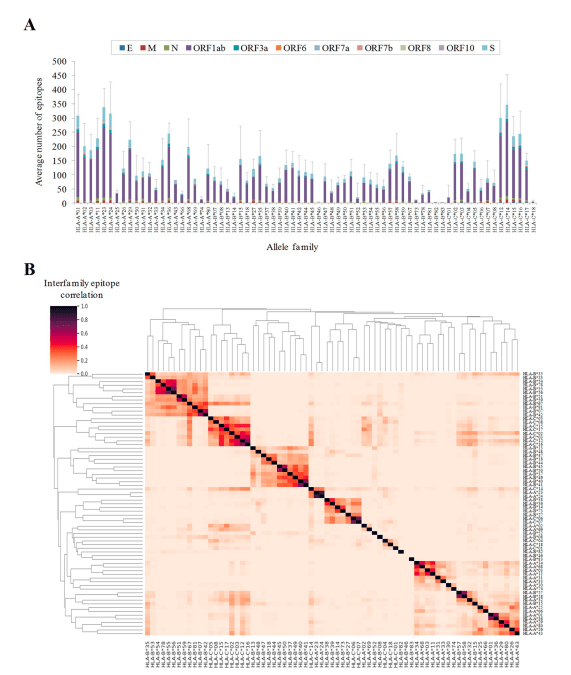 Figure 1: Number and degree of overlap between SARS-CoV-2 epitopes for different HLA-class I allelic families. (A) Average number of predicted HLA class I epitopes by allele family and protein. The standard deviation resulting from all proteins is indicated as a single error bar. (B) Hierarchical clustering and associated heatmap indicating the degree of inter-family epitope correlation. Color intensity expresses the Jaccard index for the epitope intersection between all family pairs. Perfect location match between epitopes calculated by netMHCIpan 4.1 EL with score 0.5 and rank 0.5 were utilized to calculate intersection and union. Intra-family conserved epitopes (50% alleles in the family by exact match) are in S1 Table (Fiox, et al., 2022).