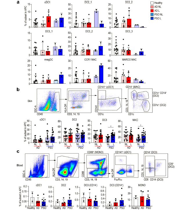 “Our study comprehensively describes the molecular characteristics of macrophages and DC subsets in AD and PSO at single-cell resolution, and identifies CD14+ DC3s as potential promoters of inflammation in PSO.” (Nakamizo, et al., 2021).
