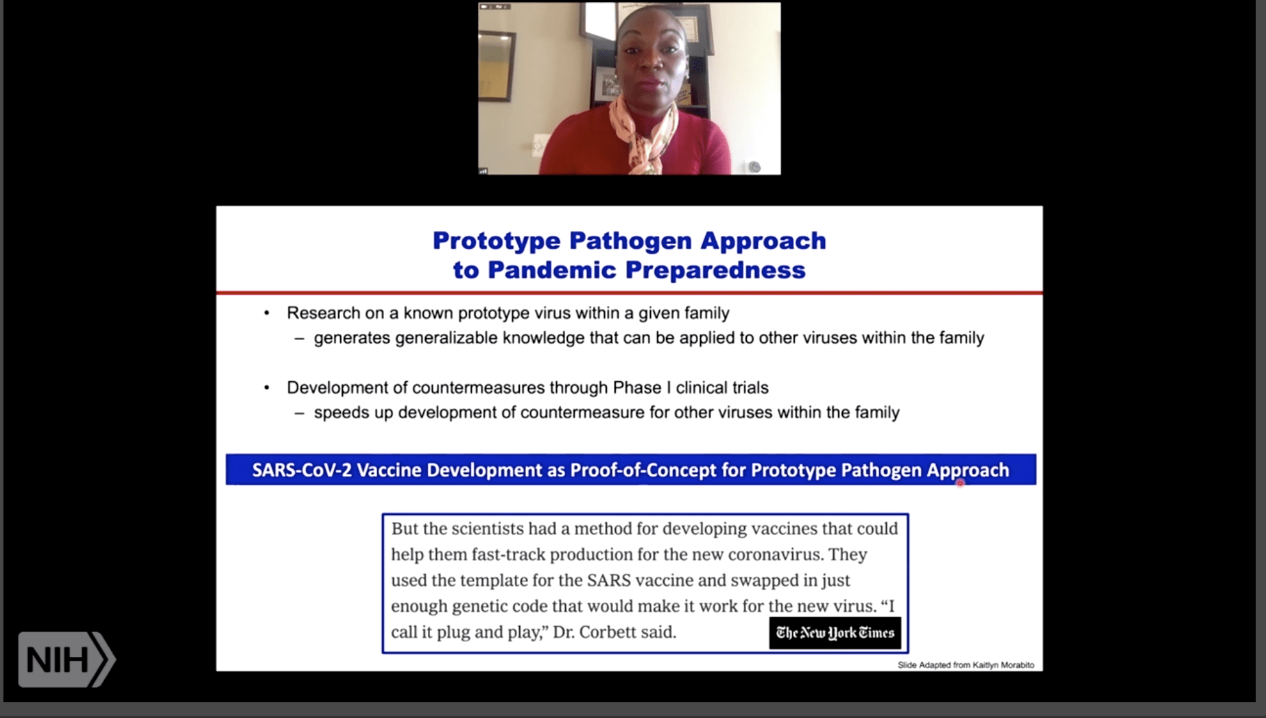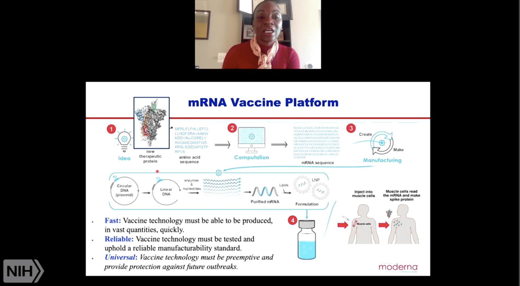 The US National Institutes of Health (NIH) hosts regular COVID-19 Scientific Interest Group meetings. This week we highlight the COVID-19 SIG meeting that featured a talk by Dr Kizzmekia Corbett (NIH) on “SARS-CoV-2 mRNA Vaccine Development Enabled by Prototype Pathogen Preparedness.