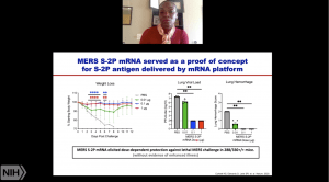 She then described research on MERS-CoV that the group undertook to develop a vaccine candidate against the virus and provided necessary groundwork that facilitated the development of mRNA-1273. Specifically, pre-clinical MERS-CoV DNA based vaccine studies identified the S1 region of the spike protein as a very immunogenic vaccine antigen. mRNA vaccine platform provides a fast, reliable and universal technology that enables rapid development of GMP ready vaccines. In collaboration with Moderna and other academic institutions, they performed a proof of concept study that used an mRNA vaccine platform to deliver MERS-spike protein. This study successfully demonstrated the utility of the vaccine strategy in inducing neutralising antibodies that protected mice from a lethal challenge (Also read: Corbett et al., 2020 Nature).