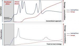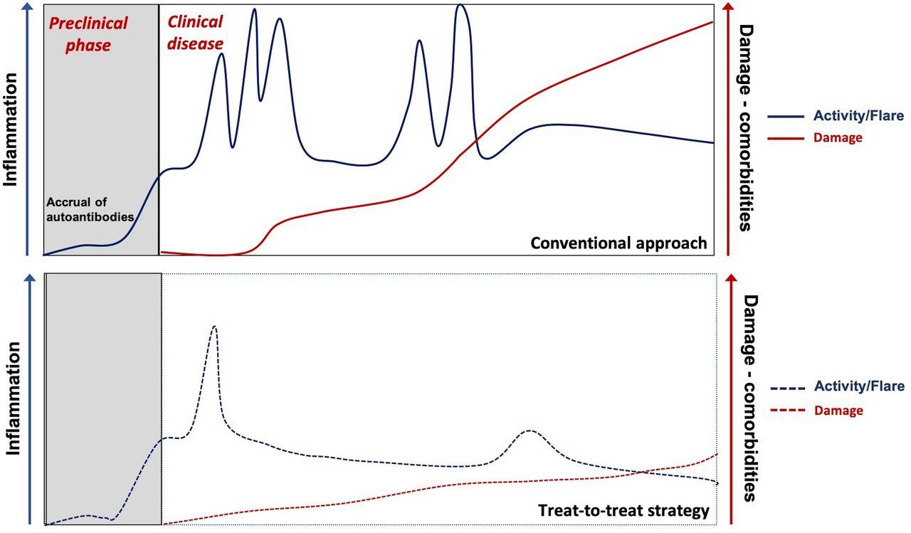 Figure 1: Natural history of SLE and the potential impact of a treat-to-target strategy. The disease starts with a preclinical, asymptomatic phase characterised initially by the appearance of autoantibodies common to all autoimmune diseases and, later, of lupus-specific autoantibodies. Subsequent clinical course is characterised by periods of variable disease activity (measured by SLE disease activity indices), with frequent flares resulting in inflammation-driven irreversible damage. Damage—measured by the SLICC/ACR damage index—increases the morbidity and mortality in SLE. Damage is driven initially by inflammation and later—with progression of the disease—also by therapy. With time, comorbidities such as infections, premature atherosclerosis and malignancies become an important part of the disease burden. Effective therapy targeting low-disease activity or remission has the potential to decrease the frequency and severity of lupus flares and resulting damage. ACR, American College of Rheumatology; SLE, systemic lupus erythematosus (Source: Boumpas, D.T., et al., 2021).