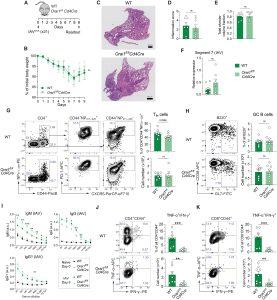 Figure 1: Deletion of Orai1 in T cells does not attenuate pulmonary inflammation and antibody production after infection with IAV. (A) Mouse model of x31 (H3N2) IAV infection. (B) Body weight of WT versus Orai1fl/flCd4Cre mice after infection with IAV, shown as weight normalized to day 0. (C) Representative hematoxylin and eosin (H&E) stains of lungs from WT and Orai1fl/flCd4Cre mice at day 9 after infection with x31 influenza A. Scale bar, 500 μm. (D) Inflammation score calculated from the lungs of WT and Orai1fl/flCd4Cre mice at day 9 following IAV infection. (E) Total alveolar volume fraction of lungs from WT and Orai1fl/flCd4Cre mice. (F) qRT-PCR analysis of IAV (segment 7) levels in total lung tissue from WT versus Orai1fl/flCd4Cre mice at day 9 after infection. (G) Representative flow cytometry plots of IAV-specific CXCR5+PD-1+ Tfh cells, their frequencies (%), and absolute numbers in mediastinal lymph nodes (mLNs) from WT and Orai1fl/flCd4Cre mice 9 days after IAV infection. (H) Representative flow cytometry plots of B220+CD38−GL7+ GC B cells, their frequencies (%), and absolute numbers in mLNs from WT and Orai1fl/flCd4Cre mice 9 days after IAV infection. FITC, fluorescein isothiocyanate. (I) IAV (x31)–specific IgM, IgG, and IgG1 levels in the serum of WT and Orai1fl/flCd4Cre mice before (day 0) and after (day 9) IAV infection. a.u., arbitrary units. (J and K) Analysis of TNF-α– and IFN-γ–producing CD4+CD44+ (J) and CD8+CD44+ (K) T cells from mLNs of WT and Orai1fl/flCd4Cre mice at day 9 after IAV infection. Representative flow cytometry plots, frequencies (%), and total numbers of T cells. Data in (A) to (K) are the means ± SEM of eight WT and eight Orai1fl/flCd4Cre mice and two independent experiments. Statistical analysis is performed by unpaired Student’s t test with the following significance levels: ***P < 0.001; **P < 0.01; *P < 0.05. ns, not significant.