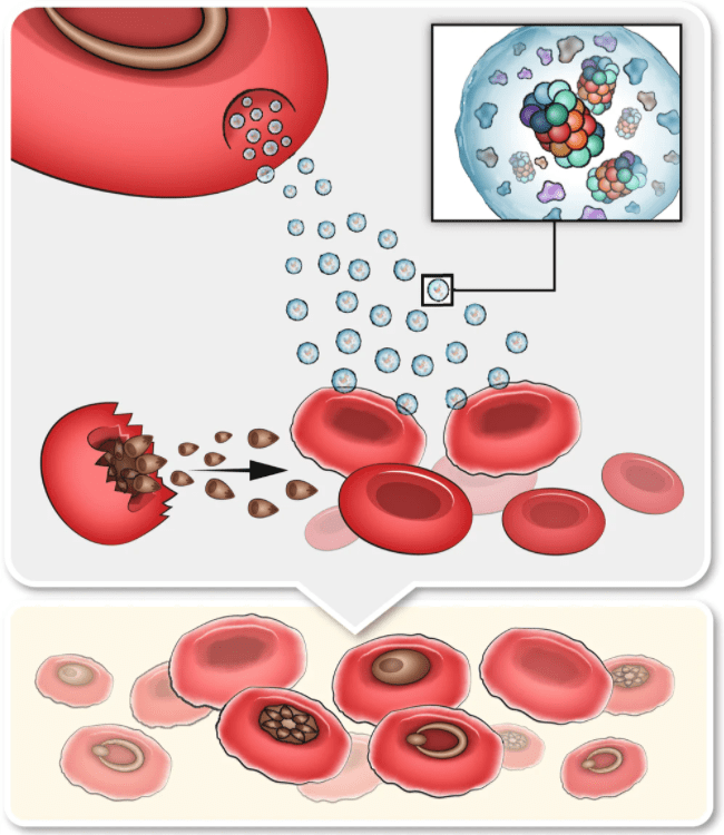 Treatment of naïve RBCs with EVs derived from malaria-infected RBCs led to significantly improved parasite growth. When further analyzing the EVs protein content, the authors found various parasitic and host kinases together with a fully functional 20S proteasome encapsulated within the vesicles. These 20S proteasomes are employed by Pf to increase RBC membrane deformability and to disturb the structural integrity. This is achieved by phosphorylation of four proteins in the RBC cell cortex subsequently targeting them for degradation by the EV 20S proteasome. These processes are considered as priming of the naïve host RBCs for invasion by the malaria parasite.