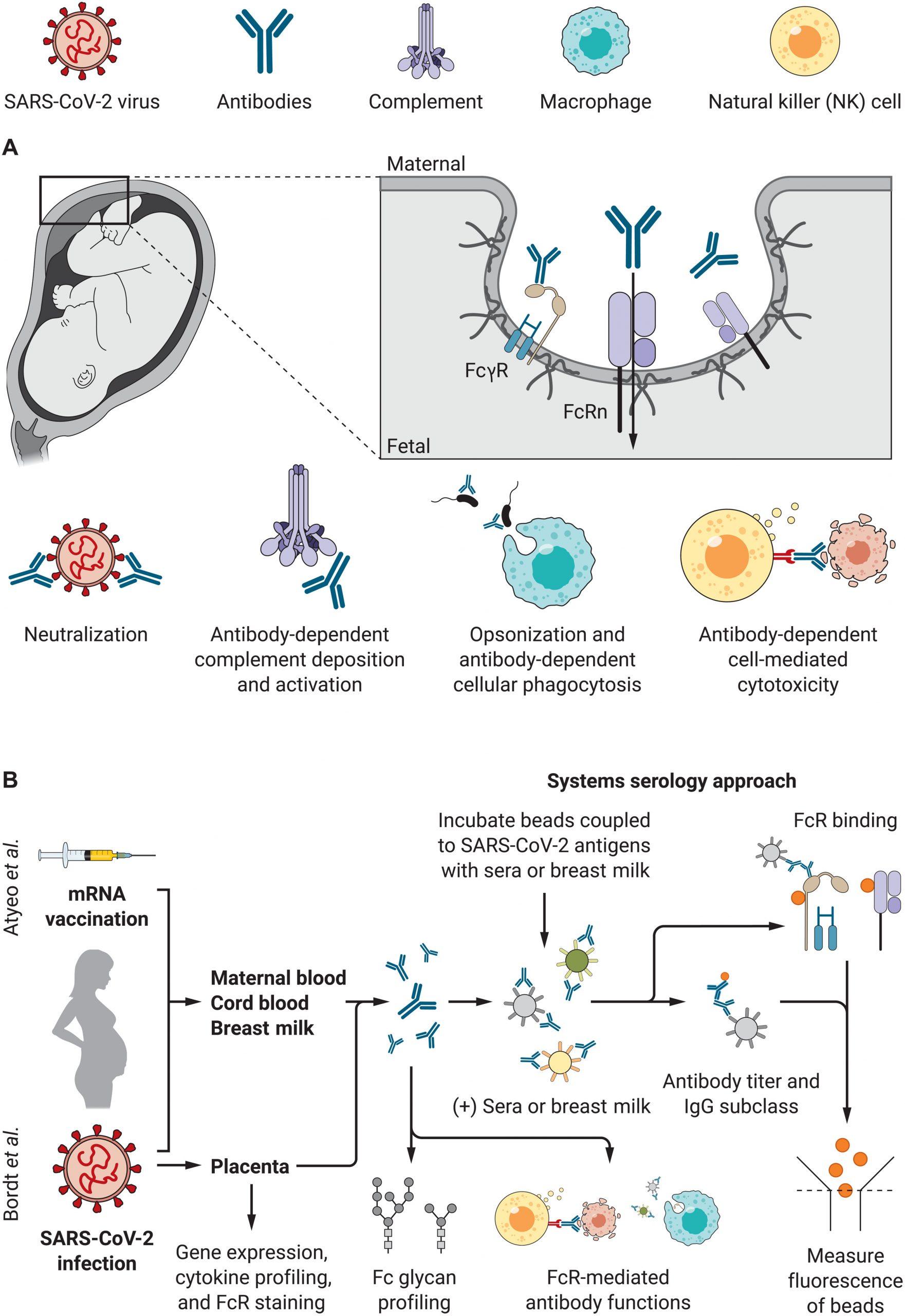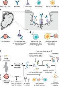 Passive transfer of antibodies occurs through the placenta and breastmilk that equips the fetus with a host of functional immunoglobulins (Ig) (For more: SARS–CoV-2 infection of the placenta). Maternal IgG is transferred to the fetus by binding to the Fc-domain receptors (FcRs) located on the surface of the syncytiotrophoblast cell (multinucleated) layer overlying the placenta. The neonatal Fc receptor (FcRn) is the pri-mary placental IgG transfer receptor, but other placentally-expressed Fcγ receptors also modulate transfer efficiency. Transplacental transfer and differential glycation of the antibody Fc-domains is dependent on antibody-FcR binding which has a significant influence on the quantity of antibody transferred. Following parturition, mothers transfer IgA-isotype antibodies through breastmilk, which can protect infants against enteric and respiratory infections. Once in the neonatal circulation, maternal antibodies can coordinate diverse immune functions. These include direct antigen neutralization and non-neutralizing, cell-mediated functions (Figure 1), many of which are orchestrated by FcγRs. In short, the method of antigen exposure dictates the constituents of the antibody repertoire.