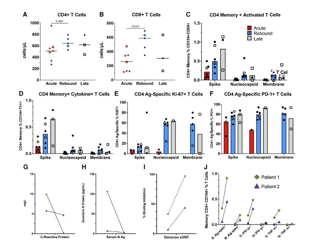 Figure 1: Comparison of CD4+ T-cell responses across the groups and longitudinal immune responses of the 2 patients with sampling at acute and rebound time points. Absolute T-cell counts compared across groups (A, B). Lines represent median values and points represent individual results. The 2 longitudinal patients are identified by an open triangle and open diamond. The empty square represents the coronavirus disease 2019 rebound patient who did not receive nirmatrelvir-ritonavir. T-cell subset flow cytometry data not available for longitudinal patient 2 (triangle) at rebound time point. T-cell stimulations were performed with peptide pools corresponding to spike, nucleocapsid, and membrane proteins as listed on the x-axis. Bars represent medians and groups are defined as acute, rebound, and late presentations. Severe acute respiratory syndrome coronavirus 2–specific CD4 T-cell responses are highlighted by memory (C), cytokine-producing (CD154 + IFN-γ+, CD154 + TNF-α+ or CD154 + IL-2+) (D), activated (CD154 + CD69+) (E), or Ag-specific proliferating (Ki-67+) and activated (PD-1+) T cells (F). For phenotyping of Ki-67 + and PD-1+ cells, a threshold of at least 20 events and a 2-fold increase over unstimulated cells was used, and samples were excluded if they did not meet these thresholds (E, F). Serum N Ag and C-reactive protein trends from the 2 longitudinal patients (G, H). T-cell responses and neutralizing antibodies from the acute and rebound presentation for 2 patients with longitudinal samples (I, J). T-cell responses are from S and N stimulations. Ag-specific CD4 T cells defined by (CD154 + CD69+, CD154 + IFN-γ+ and CD154 + TNF-α+), and neutralizing antibodies represented by percent binding inhibition on the sVNT. Abbreviations: Ag, antigen; S, spike; N, nucleocapsid; spec, specific; sVNT, surrogate virus neutralization test.