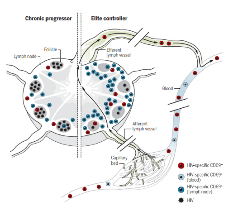 Buggert and colleagues obtained lymphoid tissues from HIV infected individuals and carried out comprehensive analysis of the CD8+ T cell population. They report a subset of CD8+ T cells in LN that shows a Trm phenotype demonstrated by phenotypic, transcriptional, epigenetic and functional experiments. This cell population is non-circulating and take residency in LN late after extensive cycling in response to antigen. Furthermore, HIV elite controllers (non-treated HIV infected individuals that maintain a very low viral load) have high quantities of HIV specific Trm at LN.