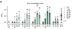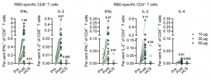 Sahin et al., reported a dose-dependent increase in reported reactogenicity, mild-medium side effects, C reactive-protein and a decrease in blood lymphocyte counts in vaccinees, which resolved quickly. They reported a dose-dependent increase in BNT162b1-specific IgG and neutralisation capacity, which were significantly boosted by the 2nd vaccination. Additionally, vaccine-induced antibody titres that were superior to those detected in COVID-19 convalescent sera. To ensure that vaccine-induced immunity also targeted other SARS-CoV-2 variants, they showed that BNT162b1-specific antibodies could also neutralise 17 other SARS-CoV-2 viral strains including the dominant circulating strain D614G. Finally, they showed that 94.4% and 80.6% of vaccinated individuals induced robust RBD-specific CD4 and CD8 T cells, respectively, determined by IFNγ-ELISPOT. Detectable RBD-specific CD4 T cells predominantly expressed Th1 associated cytokines IFNγ and IL-2 but not IL-4 upon stimulation. Further, no dose-dependent increase in T cell immunity was observed (figure below).