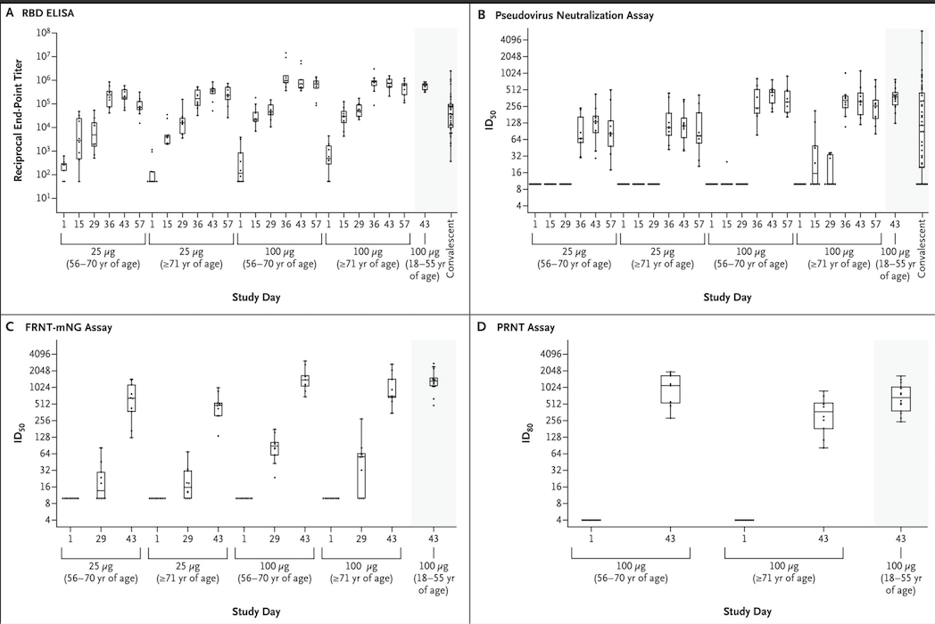 Shown are reciprocal end-point binding IgG titers on receptor-binding domain (RBD) enzyme-linked immunosorbent assay (ELISA) (Panel A), along with titers to 614D on the pseudovirus neutralization assay at a 50% inhibitory dilution (ID50) (Panel B), on the focus reduction neutralization test mNeonGreen assay (FRNT-mNG ID50) (Panel C), and on plaque-reduction neutralization testing (PRNT80) (Panel D).2 PRNT80 results were available only for the participants who had received the 100-μg dose of the mRNA-1273 vaccine on days 1 and 43. Boxes denote interquartile ranges, and horizontal bars denote median end-point titers. Whisker end points denote the maximum and minimum values below or above the median at 1.5 times the interquartile range. The shaded portion on the right side of each panel indicates one or two categories of reference values: antibody titers from 41 controls who had donated convalescent serum (Panels A and B) and antibody titers from participants between the ages of 18 and 55 years who had received the 100-μg dose of mRNA-1273 (Panels A through D) (Source: Anderson et al., 2020 NEJM)