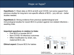 Prof Christine explained two main hypotheses around BCG & COVID-19: (1) BCG-at-birth protects against COVID-19 & Recent BCG protects against COVID-10. Currently, no direct evidence for either is available, however, a plethora of ecological studies have suggested that the first hypothesis is responsible for low COVID-19 prevalence in some countries (Read: BCG & COVID-19). Realistically, this may not be possible because trained immunity is short lived < 2 years, suggesting that it may not be the sole reason for reduced burden in countries where BCG is still give. For hypothesis 2, trials are currently investigating are on-going, in the meantime observation studies provide evidence that recent BCG vaccination is associated with lower the risk of COVID-19 (Moorlag et al., 2020; Amirlak et al., Pre-print)