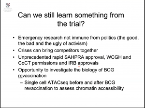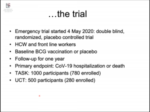 Prof Gerhard Walzl then presented his talk on “BCG trials for COVID-19 in SA: progress and promise”. He highlighted challenges the SA healthcare system expriences which include high burden of TB, HIV and more recently non-communicable diseases like diabetes, and also inadequate intensive care facilities among others see below. He then described why BCG re-vaccination was “trailed”, and some challenges they experienced which included: funding challenges “poor buy in from govt”, PPE shortages, lockdown etc.