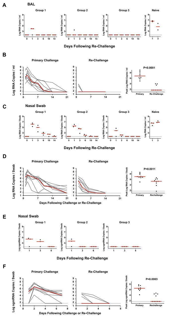 On day 35 following initial infection (Fig. 1), rhesus macaques were rechallenged with SARS-CoV-2by the intranasal and intratracheal route with 1.1 × 106 PFU (Group 1; N = 3), 1.1 × 105 PFU (Group 2; N = 3), or 1.1 × 104 PFU (Group 3; N = 3). Three naïve animals were included as a positive control in the rechallenge experiment. (A) Log10 viral RNA copies/ml (limit 50 copies/ml) were assessed in bronchoalveolar lavage (BAL) at multiple timepoints following rechallenge. One of the naïve animals could not be lavaged. (B) Comparison of viral RNA in BAL following primary challenge and rechallenge. (C and E) Log10 viral RNA copies/ml (C) and log10 sgmRNA copies/swab (limit 50 copies/ml) (E) were assessed in nasal swabs (NS) at multiple timepoints following rechallenge. (D and F) Comparison of viral RNA (D) and sgmRNA (F) in NS following primary challenge and rechallenge. Red horizontal bars reflect median viral loads. P-values reflect two-sided Mann-Whitney tests. (Source: Chandrashekar et al., 2020)