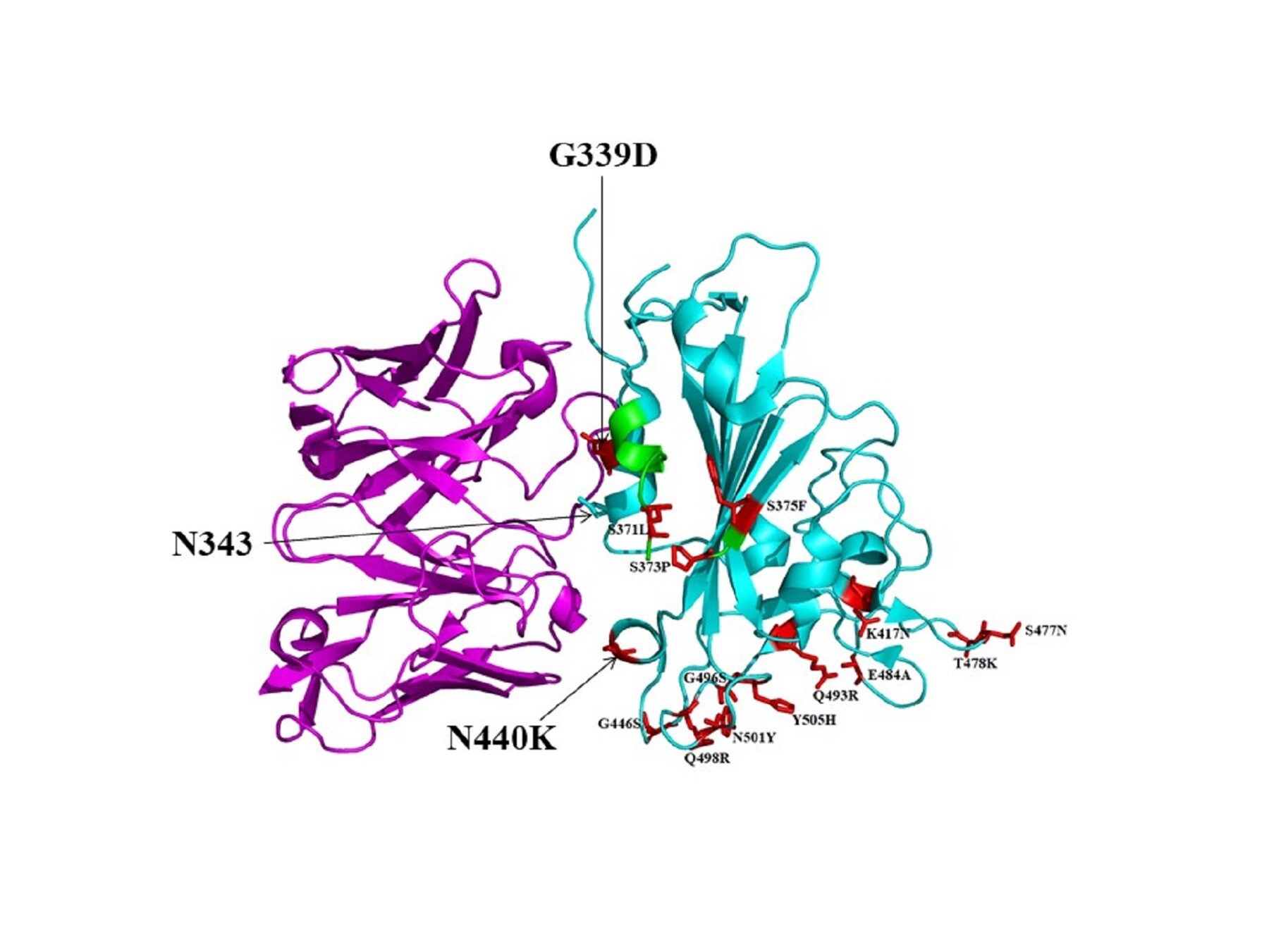 Figure 1: A cartoon representation of Omicron RBD (cyan) in complex with the therapeutically approved sarbecovirus monoclonal antibody S309 Fab (magenta) (PDB entry: 7TN0). G339D and N440K mutations found near or within the S309 antigenic recognition site are indicated in red sticks. S309 recognizes N343 glycan indicating non-significant alteration of S309 binding to Omicron RBD (McCallum, et al., 2022).
