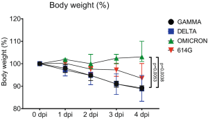 As shown in Figure 1, it was seen that Omicron infection in hamsters did not cause weight loss and induced minimal macroscopic lesions in the lungs. SARS-CoV-2 Omicron infected hamsters showed an average increase in body weight of 3.1% (figure 1) in comparison to infection with other VOCs, alongside the presence of very minimal foci of reddish discoloration.