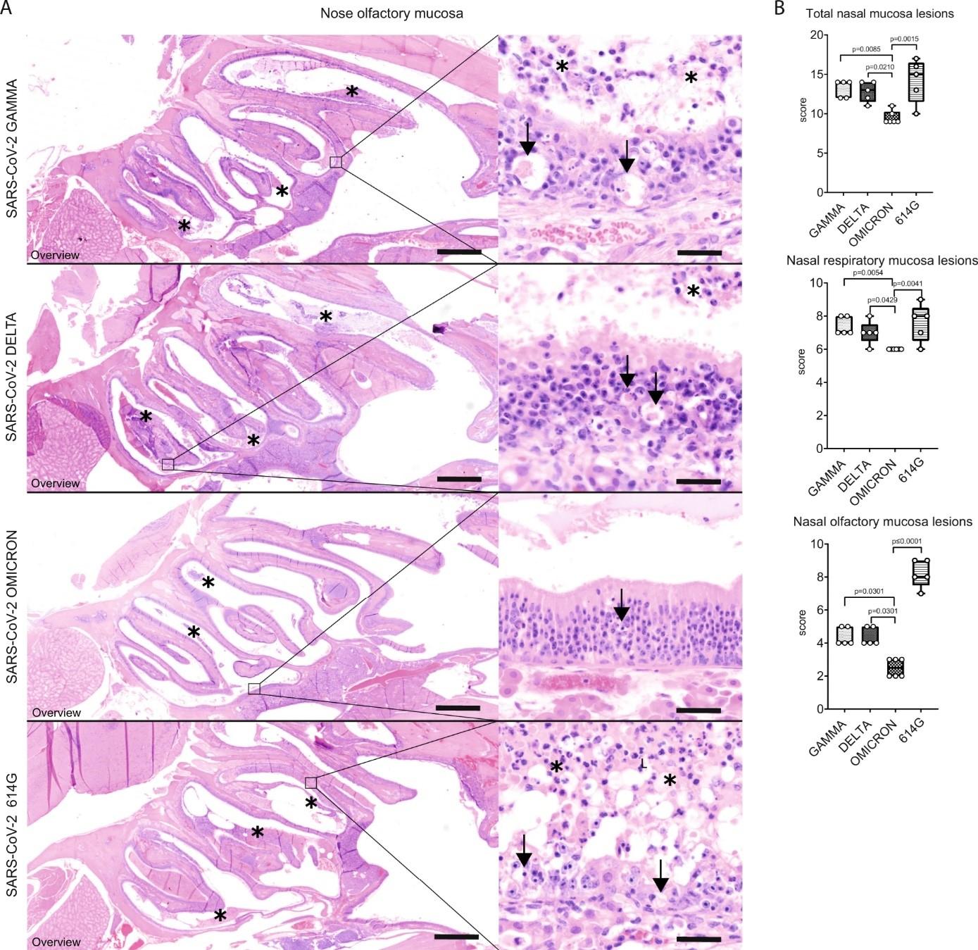 In figure 2, we see that VOC Omicron infection in hamsters displays decreased pathogenicity for the upper respiratory tract. Hamsters infected with the Omicron strain had a far milder form of rhinitis in comparison to those with SARS-CoV-2 614 G, Delta and Gamma. The histopatholgical lesions from all VOC were looked at based on a semi-quantitative scoring system which included levels of inflammation, hyperplasia, necrosis, and intraluminal cell debris. The score from hamsters infected with VOC Omicron was significantly lower.