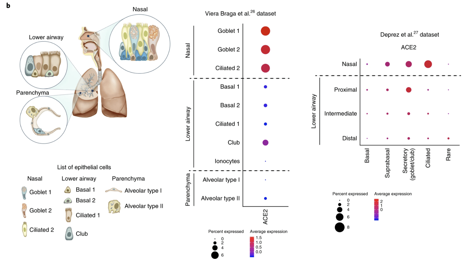 The binding affinity of the SARS-CoV-2 Spike (S) protein for ACE2 is known to be a major determinant of viral replication rate and disease severity, and viral entry depends on TMPRSS2 protease activity. Low level expression of ACE2 was found in cells from airways, cornea, oesophagus, ileum, colon, liver, gall bladder, heart, kidney and testis, suggestive that ACE2, and not TMPRSS2, may be a limiting factor for viral entry at the initial stage of infection. The authors went onto investigate nasal epithelial cells in an independent scRNA-seq study from nasal brushings and biopsies and show the highest expression of ACE2 was found in nasal goblet and ciliated cells. The authors conclude that these cells serve as “loci of original infection and possible reservoirs for dissemination within and between individuals.”