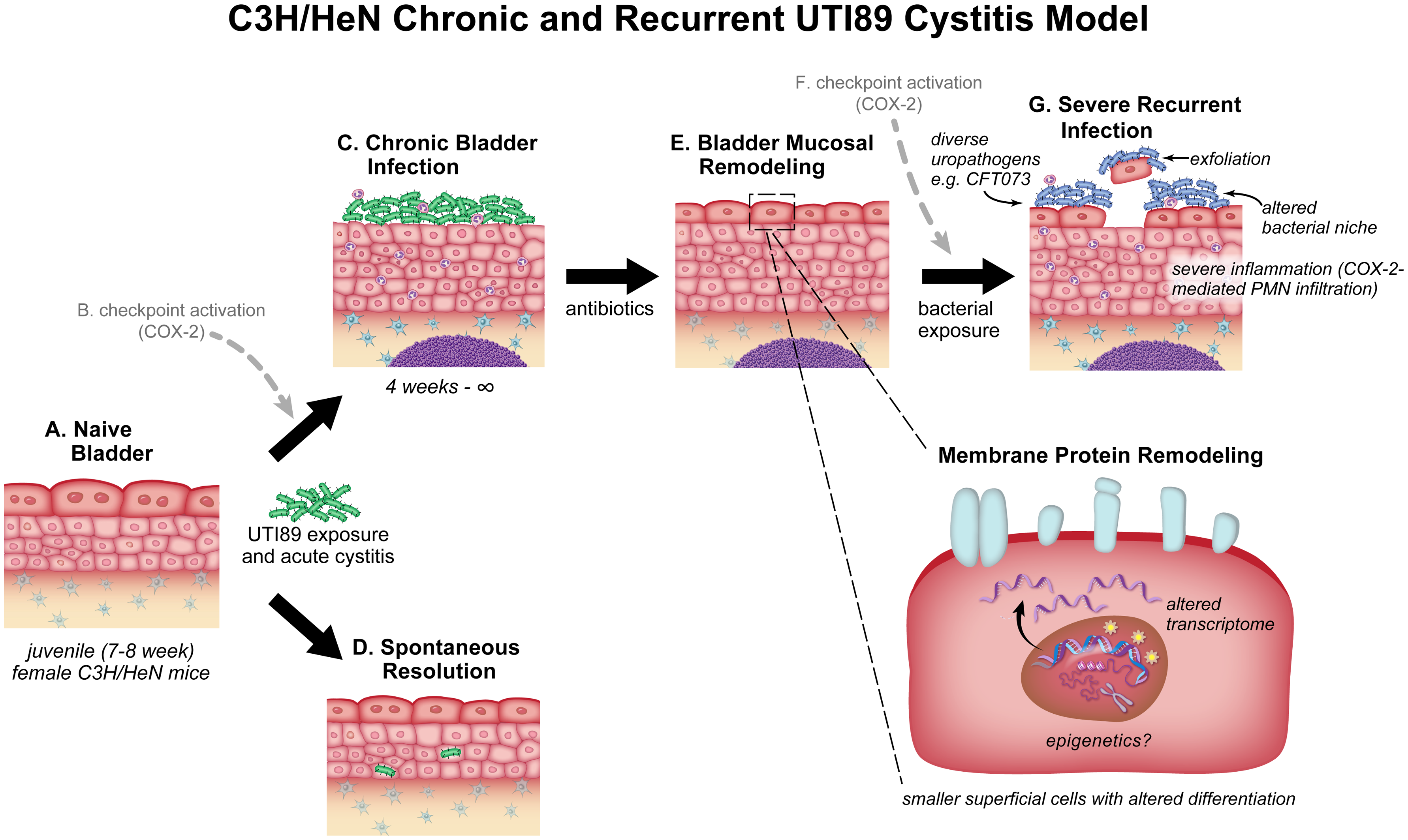 Researchers have previously shown in mice that UT189 either spontaneously resolves or causes chronic bladder infection that requires antibiotic treatment to clear. In addition, they showed that chronic bladder infection occurred after activation of COX-2, and results in a molecular imprint rendering the mice highly susceptible to severe recurrent infections. In this study O’Brien et al., showed that CFT073 does not cause a chronic infection, instead the infection spontaneously resolves without the need of antibiotic treatment. Unlike the UT189 strain, CFT073 prevents recurrent UTI due to CFT073. However, this protective effect was not observed in response to secondary challenge with UT189, highlighting a strain-specific predisposition to recurrent UTI. This finding suggested a potential role of adaptive immunity in clearing infection and preventing reinfection.
