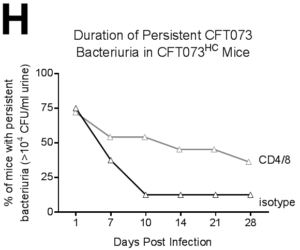 To determine if cellular immunity contributed to this predisposition, they depleted T cells during either during primary or secondary UTI. O’Brien et al., showed that T cell depletion did not affect UTI kinetics. Interestingly they showed that though T cell depletion increased susceptibility to recurrent CFT073 infection but had no effect on UT189 reinfection.