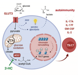 “Metabolomic, epigenetic, and transcriptomic analyses linked GLUT3 to mitochondrial glucose oxidation and ACLY-dependent acetyl-CoA generation as a rate-limiting step in the epigenetic regulation of inflammatory gene expression. Our findings are also important from a translational perspective because inhibiting GLUT3-dependent acetyl-CoA generation is a promising metabolic checkpoint to mitigate Th17-cell-mediated inflammatory diseases.”