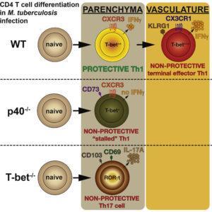 The team showed that KLRG1 expression alone was not enough to define cells that have limited control of M.tb infection. M.tb-specific KLRG1+ CD4 T cells that specifically reside in the lung vasculature but not KLRG1+ CD4 T cells found in the lung parenchyma have limited ability to control M.tb infection. Salin et al., demonstrated that T-bet and IL12/23p40 are essential for the generation of lung vasculature residingM.tb-specific KLRG1+ CD4 T cells that produce high levels of IFN-γ (terminal effector cells). Down regulation of either T-bet or IL12/23p40 molecule resulted in the generation of non-protective parenchyma residing CD4 T cells, an observation attributed due to lack of IFN-γ expression. Finally, they demonstrated that while T-bet expression is essential for Th1 T cell differentiation, it is not required for the T cell migration to the lung, in fact lack of T-bet expression by T cells was associated with accumulation of T cells in the parenchyma.