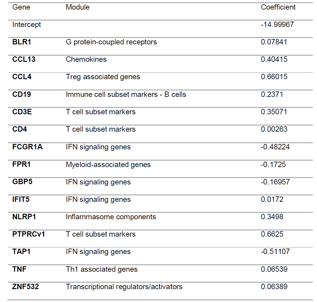 Table 2: Gene expression signature predicting month 6 versus diagnosis, obtained by pooling the study groups and cohorts (South Africa + Indonesia). The signature was developed using logistic regression with lasso regularisation. Initially, signatures were developed in the South African and Indonesian cohorts separately however, the classifying capability was low. To improve the classification performance and reduce cohort dependency, the datasets of both cohorts were pooled, leading to combined two cohort 15-gene signature above being developed.