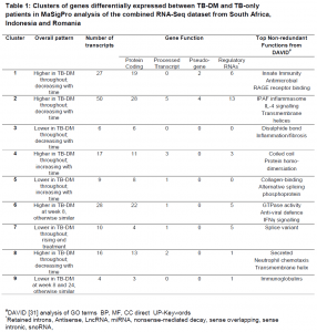 The field of transcriptomics has opened up the possibility of non-sputum-based biomarker tests for TB diagnosis and has affirmed some of what we already know about the immune response to TB i.e. it is driven by the presence of inflammatory markers and is hallmarked by a strong type I interferon response. With the expansion of what we know about transcriptomics shifting to the possibility of being able to monitor how individuals respond to TB treatment, the authors sought to identify what the transcriptomic landscape looks like for people with TB and DM during TB treatment.