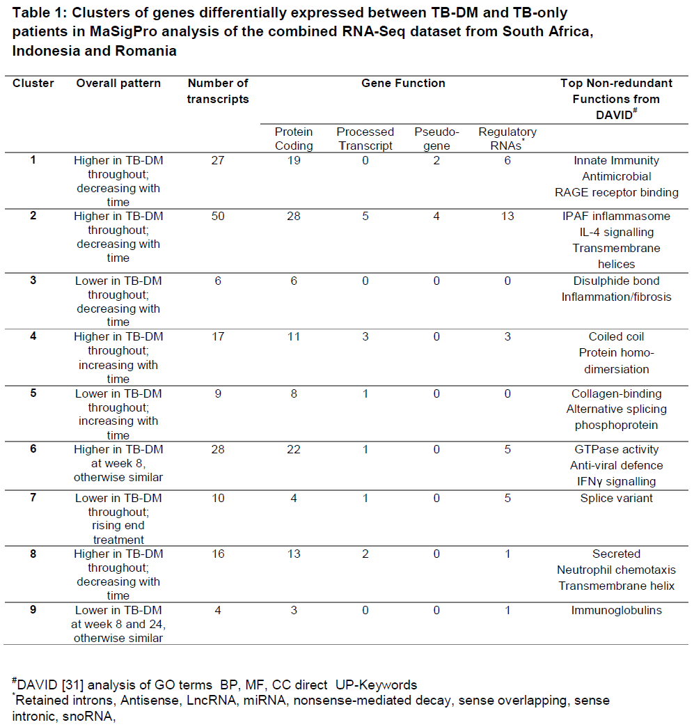 MaSigPro is an R analysis package used to find genes that are significantly and differentially expressed between between experimental groups in time course microarray and RNA-Seq experiments. Using the MaSigPro, 167 genes were found to be differentially expressed in both TB and TB-DM groups. Using hierarchical clustering, these genes were placed into 9 clusters, as shown in Table 1, based on similar expression patterns. Modular analysis was performed between TB-DM and TB-only patients where immune activation was found to be the top module in both populations since it was upregulated in TB-DM group compared to TB-only throughout treatment.