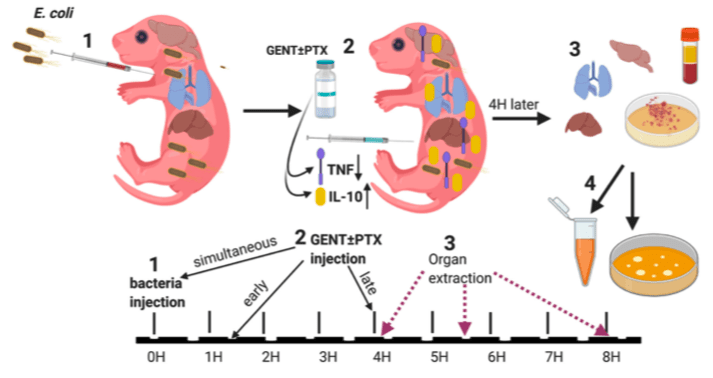 Experimental design. (1) Neonatal mice (< 24 h old) were injected with E. coli via the right intra-jugular route at the start of the experiment (0H time point). (2) Subsequently, pups were injected intraperitoneally with GENT, PTX, (GENT + PTX), or saline control immediately following bacteria injection (simultaneously, at the 0H time point), early (1.5H after bacteria injection), or late (4H after bacteria injection). (3) After additional 4H of incubation, i.e., at the 4H, 5.5H, or 8H time point from the start of the experiment, mice were euthanized and blood and organs obtained for (4) bacterial plating and cytokine measurements. (Source: Speer et al., 2020)