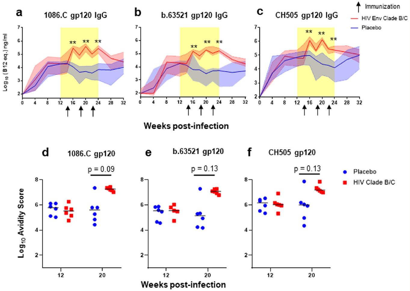 Figure 2: Plasma gp120-specifc IgG antibody binding kinetics, avidity, and breadth. Plasma gp120 IgG binding responses to vaccine antigens 1086.C (a) and b.63521 (b), and challenge virus antigen, CH505 (c) in placebo (blue) and Env vaccinated (red) macaques. Bold lines represent the median, and the range is depicted by the shaded area; black arrows indicate time points at which immunizations were administered (14, 18, and 22 wpi). Antibody avidity was assessed against vaccine and challenge antigens at week 12, pre-ART/immunization, and at week 20 when IgG gp120 binding peaked in the Env vaccinated group (d–f). Dot plots represent avidity score, each dot represents one animal, and medians are represented by horizontal lines (d–f). Statistical analysis was performed using Wilcoxon rank-sum tests with exact p-values to compare gp120-specifc IgG binding and avidity responses between vaccinated and placebo RMs, followed by FDR adjustments for multiple comparisons. **unadjusted p < 0.01. FDR adjusted p-values are reported in the dot plots.
