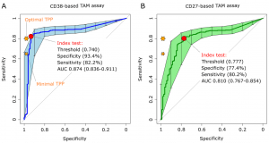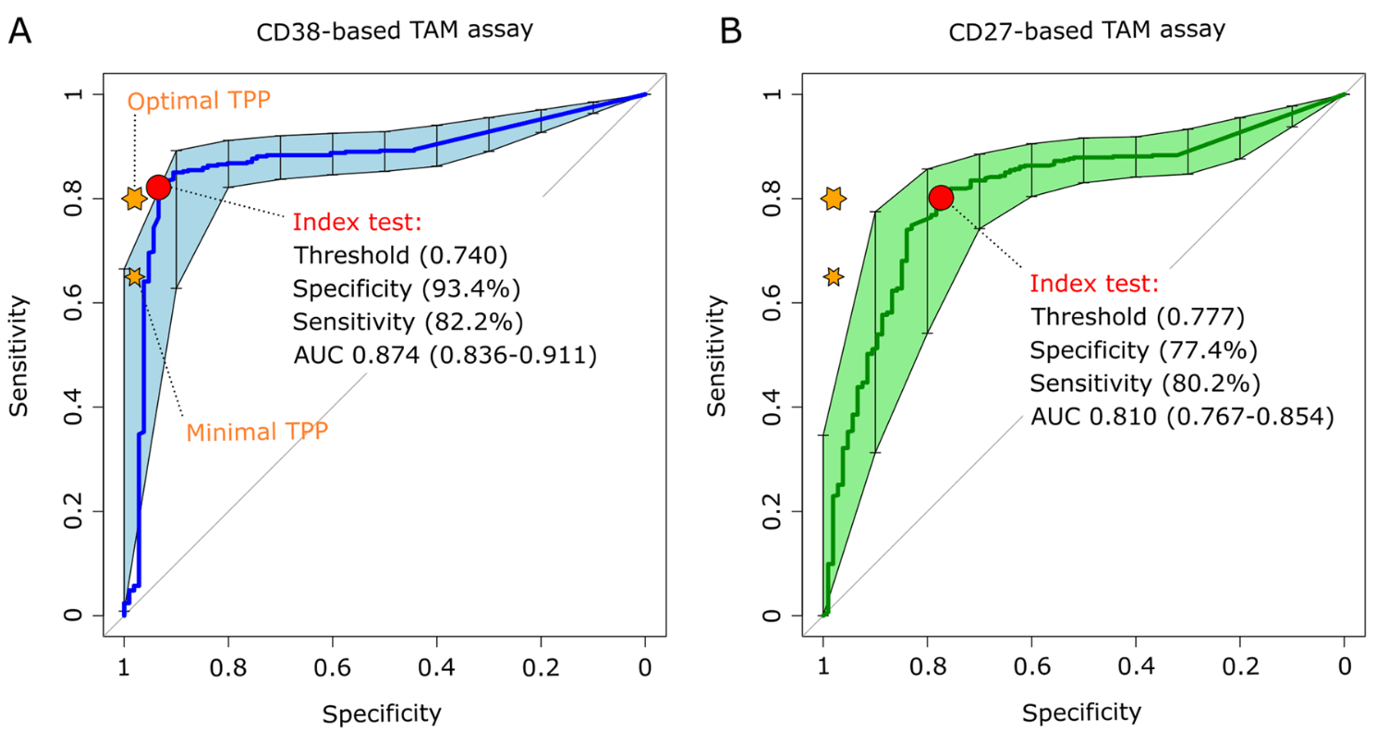 The CD38-TAM assay achieved a specificity 93.4% and sensitivity of 82.2% therefore going beyond the minimum sensitivity (80%) and almost approaching the minimal specificity (98%) highlighted in the WHO target product profile for non-sputum based diagnostic tests (World Health Organization, 2014) (Fig 2).
