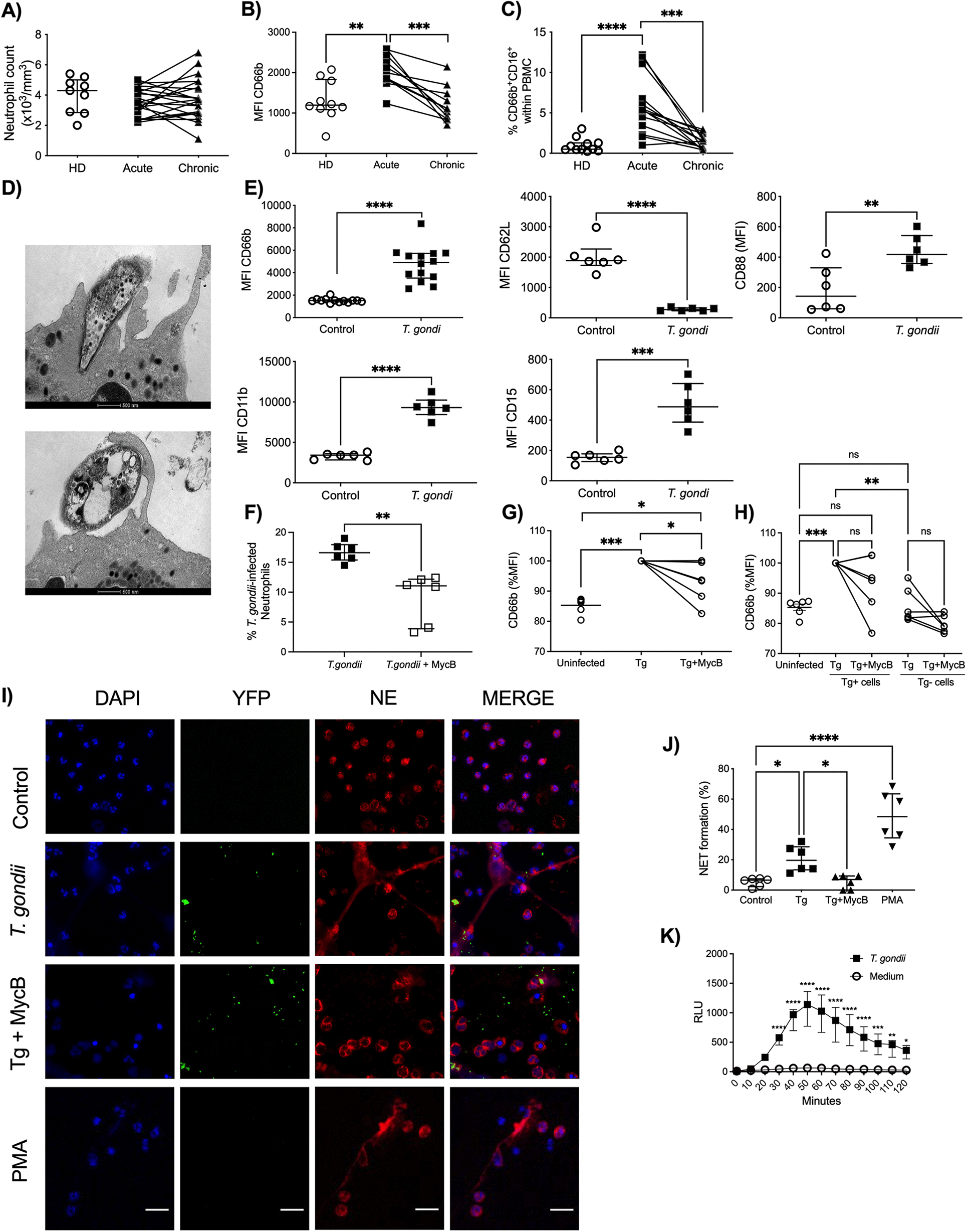 Neutrophils from acute infected patients were significantly activated as shown by the upregulation of CD66b and the presence of CD66+CD16+ cells in the PBMC fraction. Transmission electron microscopy further revealed that tachyzoites actively infect neutrophils probably through phagocytosis. Moreover, the frequency of NET formation and ROS production was increased in neutrophils from healthy donors exposed to T. gondii. These NETs further amplified the innate immune response by promoting the migration and activation of neutrophils as shown using NET supernatants. Importantly, the T. gondii induced NETs not only activated more neutrophils but amplified also the adaptive immune response by attracting T cells and inducing the production of inflammatory cytokines by PBMCs.