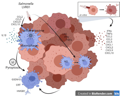 Did you know that microorganisms like bacteria or viruses can be used as immunotherapy against cancer? Bacillus Calmette-Guerin (BCG), the vaccine that protects from tuberculosis, has been the preferred immunotherapy for intravesically treating early-stage bladder cancer for the last decades. Salmonella, a different group of bacteria that can cause diarrhea, fever, and stomach cramps upon ingestion of contaminated food or water, can also be engineered to treat malignant neoplasms. In this work, researchers sought to deepen our understanding of the role of macrophages and inflammasome activation in the context of an attenuated Salmonella (LVR01) therapy against melanoma (Figure 1).