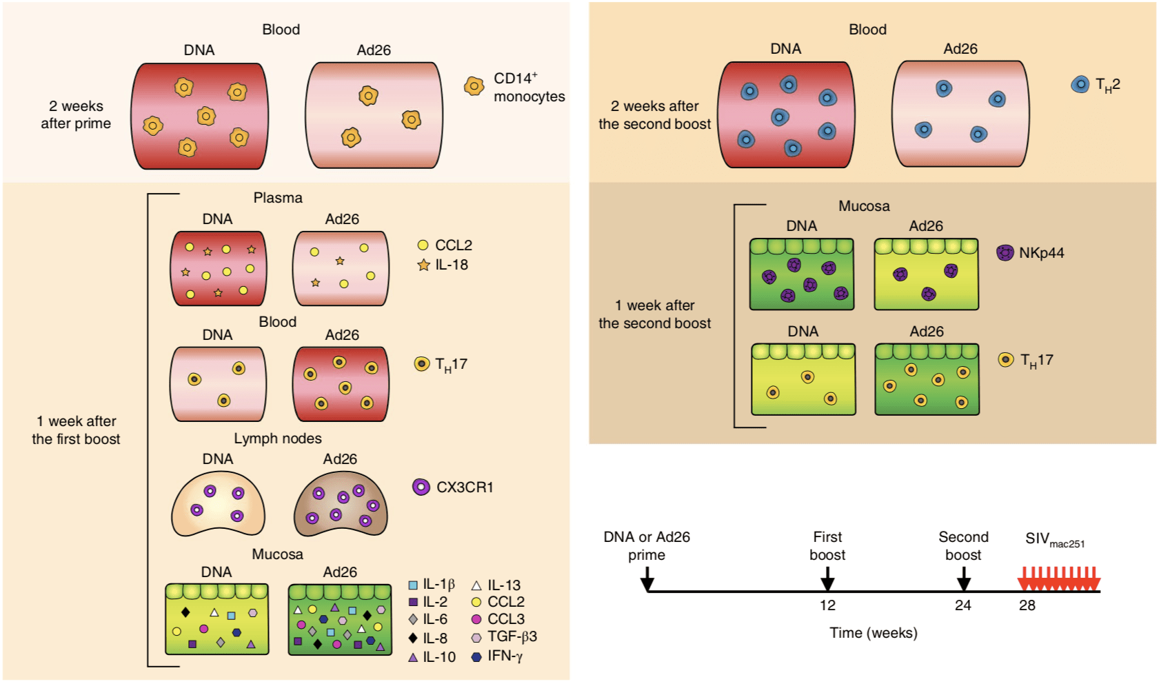 Researchers vaccinated macaques with two intramascular doses of DNA-SIV, one dose of Ad26-SIV or two doses of ALVAC-SIV, this was followed by two doses of ALVAC-SIV/gp120 alum vaccine boosts. Researchers showed that DNA-SIV and ALVAC-SIV but not Ad26-SIV were effective at decreasing risk of SIV acquisition in the macaques. Vaccari et al., observed differences in innate and adaptive immune responses between macaques primed with DNA-SIV and Ad26-SIV. Where Ad26-SIV prime resulted in enhanced differentiation of monocytes, increased levels of cytokines at mucosal sites and increased levels of long-lasting mucosal Th17 cells compared with DNA-SIV vaccination. Decreased risk of SIV acquisition in DNA-SIV primed macaques was associated with activation of the hypoxia and inflammasome pathways in classical (CD14+CD16-) monocytes as well as increased levels of CCR5- Th2 cells and cyclic V2 antibodies.