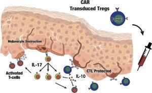Ganglioside D3 (GD3) is over-expressed by perilesional epidermal cells, including melanocytes, thus, researchers hypothesised that induction of GD3 tolerance could contribute to reduced vitiligo pathogenesis. They utilised chimeric antigen receptor (CAR)- T cell therapy to generate GD3-reactive CAR-Tregs. Using in vitro models they showed that CAR-Tregs contribute to immuno-suppression of effector cells and protects against cell-mediated cytotoxicity of melanocytes. They also showed that CAR-Treg transfer to vitiligo-prone mice provided significant protection against depigmentation. Researchers did highlight limitations of their study which can be read in-depth in the main article. These data have promise for human application and could be a potential vitiligo immunotherapy.