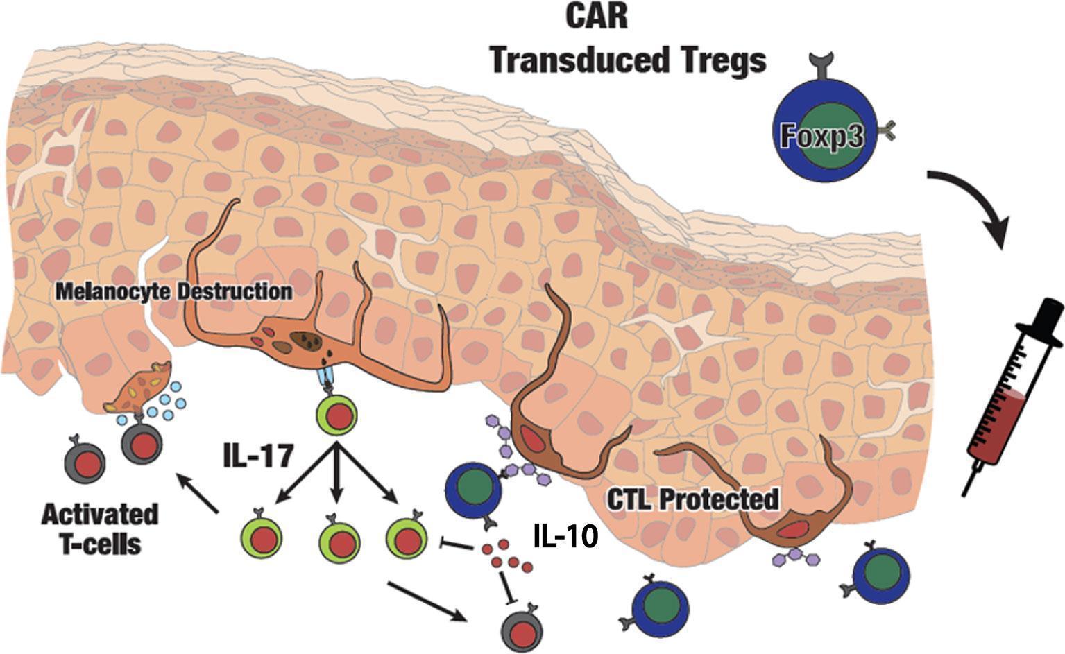 Regulatory T cells (Tregs) play a huge role in peripheral tolerance and immune homeostasis via suppression of hyperactive immune cells, including self-reactive, cytotoxic T cells. Recent studies have shown that adoptive transfer of Tregs can contribute to improved local immunosuppression and contribute to slowing the rate of disease progression. Tregs have been suggested as a potential vitiligo immunotherapeutic as the disease is associated with lower levels of Tregs. In a recent study, Mukhataye et al., demonstrate the potential utility of antigen-specific Tregs in the control of vitiligo.