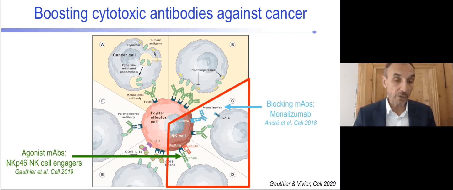 Eric Vivier began his talk by giving an overview of why targeting innate cells may improve cancer immunotherapy. He showed that Natural killer (NK) cells play a role in immune responses against cancer. Besides directly killing cancer cells independently or via antibody-dependent cellular cytotoxicity (ADCC), NK cells also release cytokines and chemokines which activate other innate cells involved in the induction of T cell-mediated immunity.
