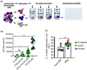In figure 1A, we see graphical representation of the experimental setup used to determine the function and cytokine profile of TFRs. The authors determined that TFRs can limit or decrease TFH help to B-cells. This comes as a result of decreased IgG detected by ELISA when TFRs were present in TFH – B cell co-cultures (Figure 1B). Regarding cytokine production, in Figure 1C, we see results from digital droplet PCR (ddPCR) where the authors looked the production of the suppressor cytokine IL-10 from a set of samples from HIV negative, HIV infected + treated as well as HIV-infected but untreated individuals. TFRs had a higher expression of IL-10 in comparison to CD4 T-cells, providing more evidence towards their suppressive capabilities.