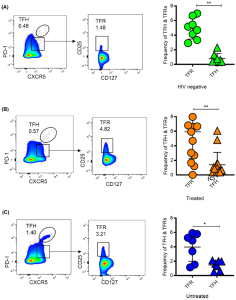 The authors concluded that “much about the role of TFRs in HIV pathogenesis remains unknown. We were unable to clearly determine the impact of HIV infection on TFR subsets due to low HIV viral loads in our clinical samples. There is need for more work to elucidate molecular mechanisms that drive TFRs expansion within the GCs, if and how the increased TFR frequencies inside GCs influence antibody production or TFH function.”