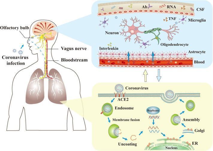 A recent review published by Troyer et al. highlights the potential immunologic mechanisms underlying neuropsychiatric links to SARS-CoV-2 infection, drawing from experiences with past CoV pandemics and current evidence [3]. One mechanism is through ACE2-receptor mediated cytokine network dysregulation. SARS-CoV-2 binds to the ACE2 receptor, expressed on neurons, glia, and gut epithelial cells, indicating a direct pathway for CNS and gastrointestinal manifestations. In one experimental study by Netland et al., intranasal inoculation of SARS-CoV-1 in ACE2 transgenic mice resulted in neuronal death and upregulation of TNF-alpha, IL-1-beta, and IL-6 by astrocytes, suggesting its role for the development of subsequent encephalopathies via CNS-localized inflammation [4].