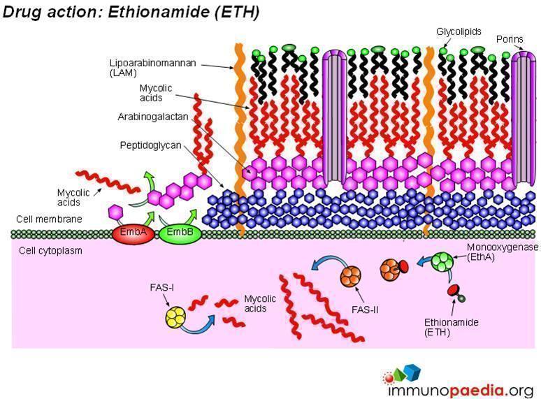 The mechanism of action of each of the second-line drugs is shown in greater detail for: Ethionamide, D-cycloserine, Ciproflaxin, Ofloxacin, Kanamycin, Amikacin, Viomycin and Capreomycin. The action of these drugs is against cell wall biosynthesis, DNA supercoiling and protein synthesis in Mycobacterium tuberculosis. Ethionamide and D-cycloserine interfere with cell wall biosynthesis by inhibiting mycolic acid synthesis and peptidoglycan synthesis, respectively. Ciproflaxin and Ofloxacin are fluoroquinolone drugs that inhibit DNA supercoiling by inhibiting the DNA gyrase enzyme. Kanamycin and Aminokacin are aminoglycoside drugs that interfere with protein synthesis by inhibiting the action of ribosomes. Similarly, Viomycin and Capreomycin are peptide drugs that also inhibit the action of ribosomes.