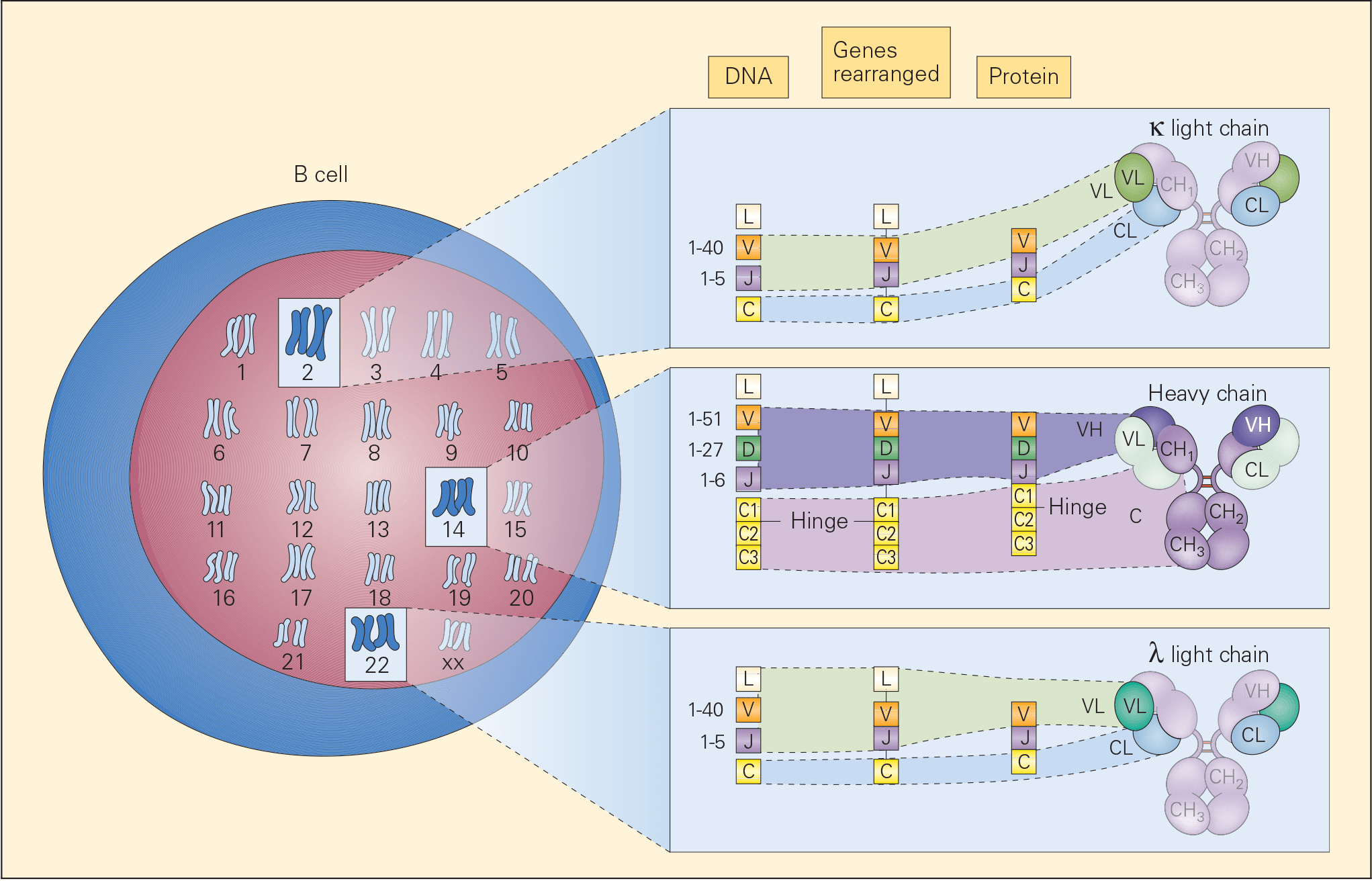 - Several elements contribute to the variability of the repertoire, including the large number of V, D, and J genes, their random rearrangement, the additional sequences created by the DNA repair mechanisms, and finally the combination of HC and LC.