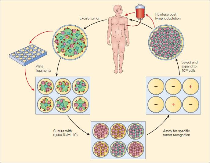 • Adoptive cell therapy requires generation of highly avid tumour-reactive T-cells derived from tumour-infiltrating lymphocytes (which can, for example, be efficiently isolated ex vivo from melanoma lesions using high levels of IL-2)