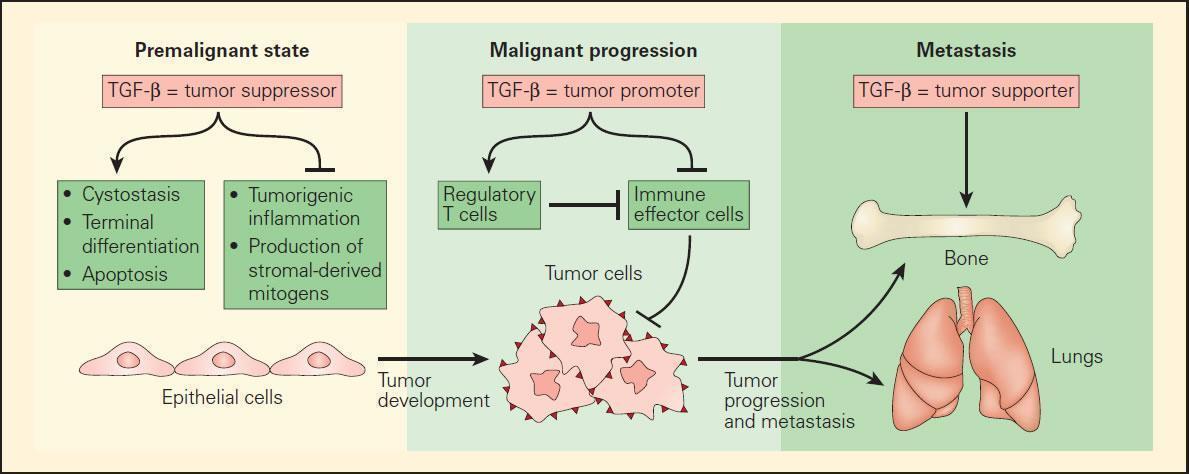 Figure 1. Schematic representation of the role of TGF-b in mediating the tumour development in an epithelial cell target progressing from the premalignant to the malignant state and terminating in the metastatic state. In the premalignant state, TGF-β functions as a tumour suppressor by blocking the expression of stromal-derived mitogens and suppressing protumourigenic inflammation. In this initial state, TGF-β supports the cytostasis, terminal differentiation, and apoptosis of premalignant cells, which have either an overexpressed oncogene or suppressed tumour-suppressor gene. Once the epithelial cells become fully malignant, TGF-β has the opposite effect by blocking the antitumour immune response either directly or through Treg cells. Once a tumour is established, TGF-β further supports the formation of metastases to several distal sites, including bone and lung tissues. [Flavell RA, Sanjabi S, Wrzesinski SH, Licona-Limon P. The polarization of immune cells in the tumour environment by TGF beta. Nat Rev Immunol. 2010;10:554–67.]