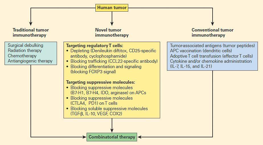 Figure 3. Comparison of traditional tumour therapy, conventional immunotherapy, and novel forms of immunotherapy, including therapeutic targeting of suppressive mechanisms, including regulatory T cells. [Zou W. Regulatory T cells, tumour immunity and immunotherapy. Nat Rev Immunol. 2006;6:295–307.]
